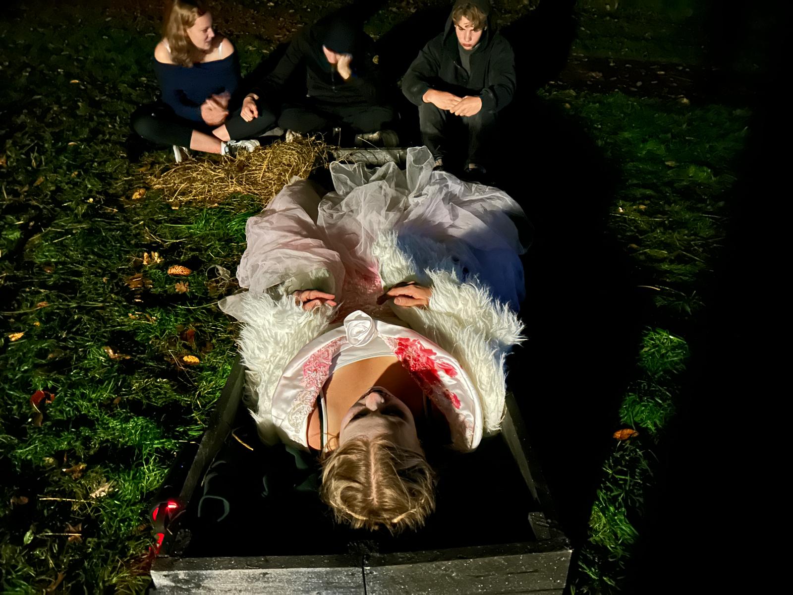 Zoals altijd hadden we twee routes: eentje speciaal voor jonge durfals, en later op de avond een extra spannende versie voor de echte horrorfans. In kleine groepjes liepen de deelnemers door het donkere bos, zonder te weten wat hen achter de volgende bocht stond te wachten…